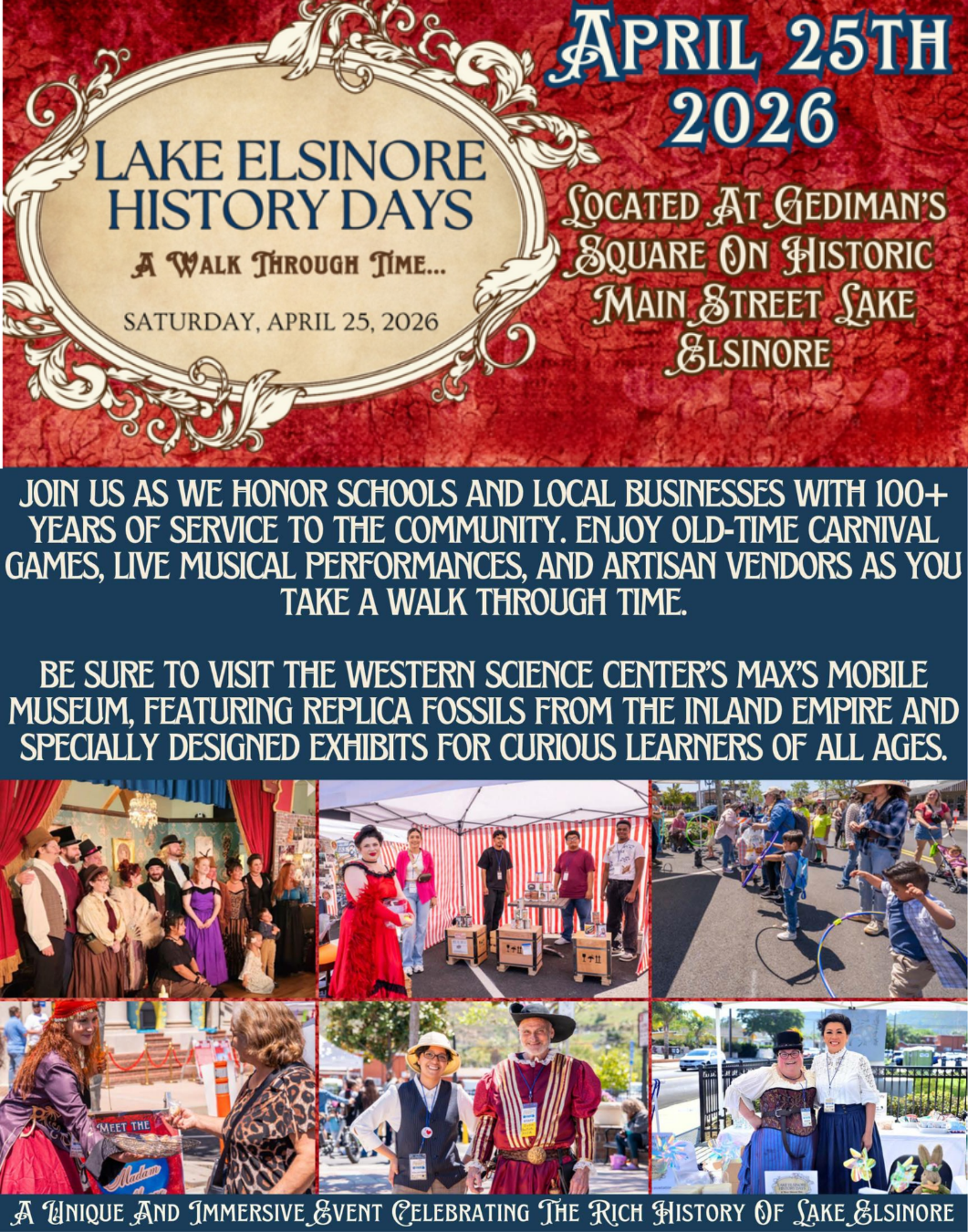 Upcoming Events Mar 25 Speaker Series : Jim Hinckley Wednesday, March 25, 2026 7:00 PM 9:00 PM Google Calendar ICS View Event → Apr 25 Lake Elsinore History Days Saturday, April 25, 2026 12:00 PM 5:00 PM Google Calendar ICS View Event →